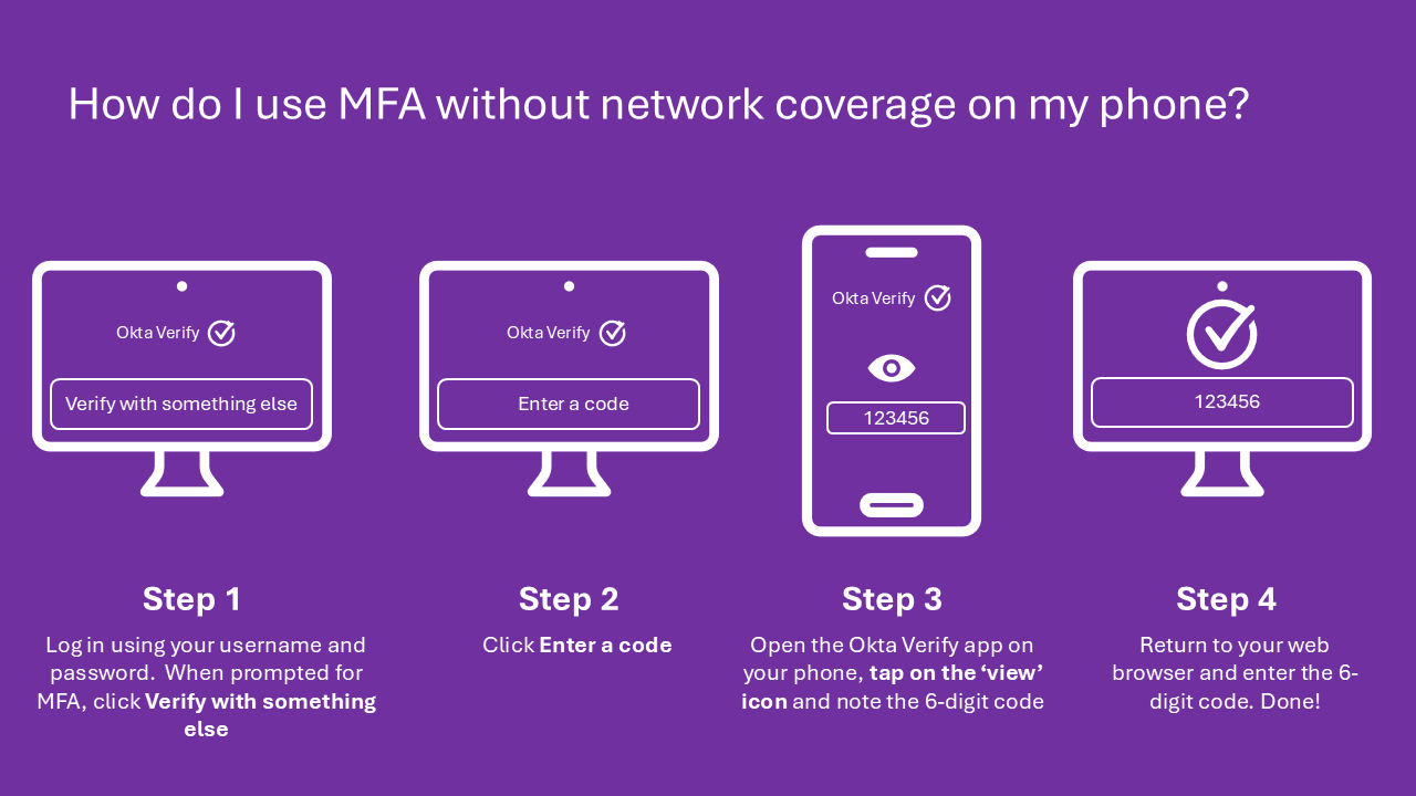If you don’t have a network connection, follow the FAQ instructions for how to ‘MFA in a location without mobile coverage’.